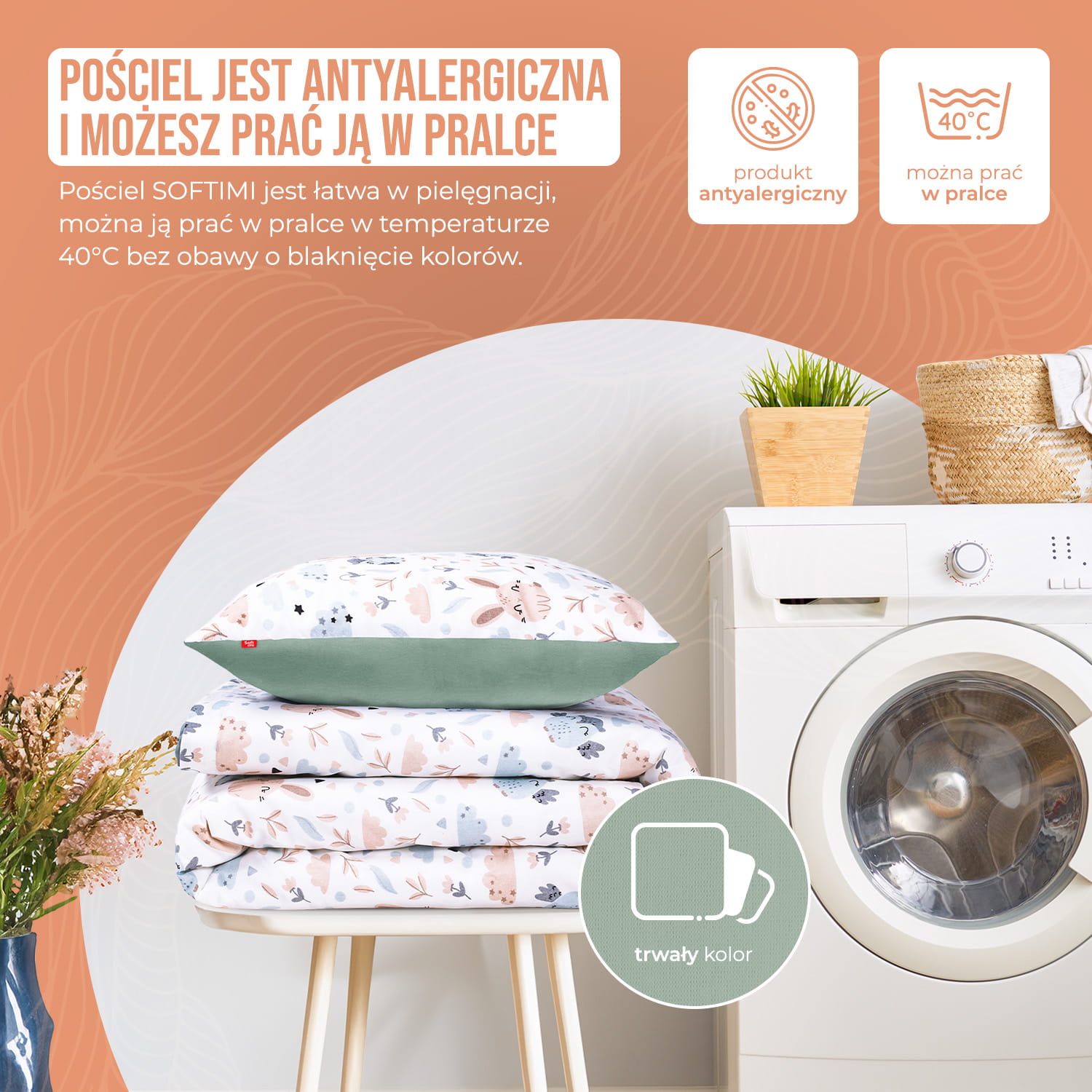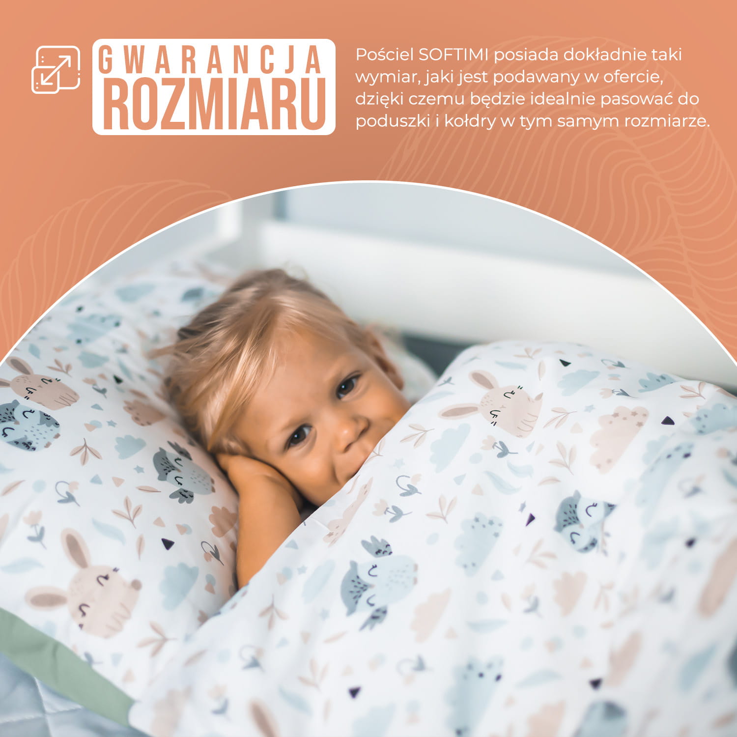 Przemień pokój swojego dziecka w prawdziwą krainę snów i wygody dzięki naszej wyjątkowej pościeli bawełnianej SOFTIMI. Uszyta ze 100% naturalnej bawełny, otula delikatnością i zapewnia maluchowi zdrowy i spokojny. Dzięki innowacyjnemu systemowi NoMove kołdra pozostaje na swoim miejscu przez całą noc, a Ty masz pewność, że Twoje dziecko będzie spało spokojnie i komfortowo każdej nocy. Pościel bawełniana SOFTIMI to idealny wybór dla najmłodszych, którzy zasługują na miękkość i ciepło od pierwszych chwil życia.