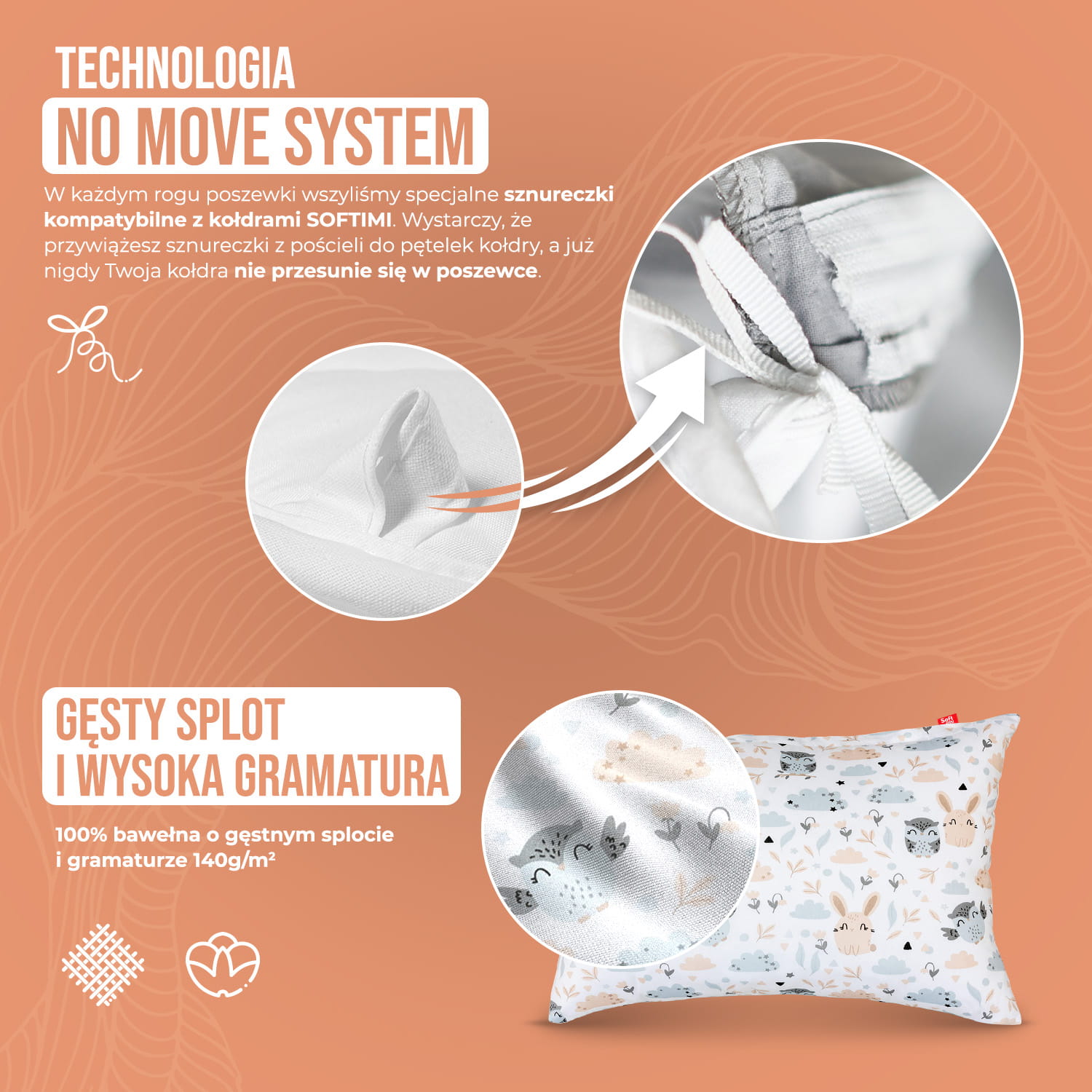NoMove System - Innowacyjność spotyka komfort dzięki naszemu systemowi NoMove. Specjalne sznureczki, które można przywiązać do pętelek w kołdrze, eliminują uciążliwe przesuwanie się kołdry w poszewce. Nasze kołdry SOFTIMI są kompatybilne z pościelami. Pościel ma sznureczki, a kołdry uszka. To praktyczne rozwiązanie sprawia, że sen staje się jeszcze przyjemniejszy.