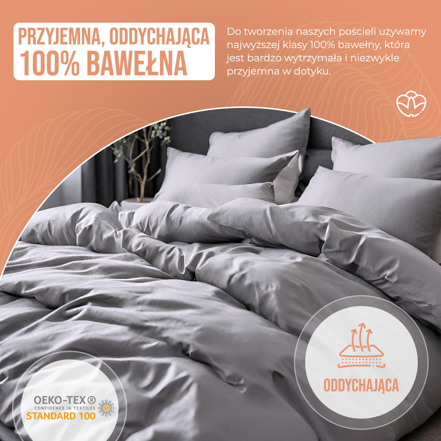 Bawełna 100% o gęstym splocie - Wykonana z bawełny o gęstym splocie i gramaturze 140g/m2, pościel zapewnia nie tylko niezrównaną miękkość, ale również trwałość, której możesz zaufać.