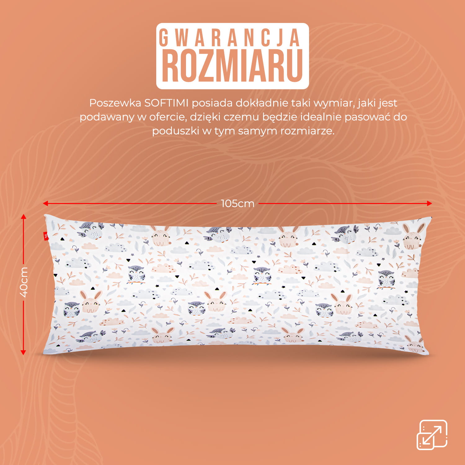Idealnie dopasowana do naszej poduszki ciążowej - Gwarantujemy, że każdy produkt ma dokładnie taki wymiar, jaki podano w ofercie. Poszewka jest idealnie dopasowana do poduszki ciążowej SOFTIMI 40x105, którą znajdziesz w naszym sklepie.
