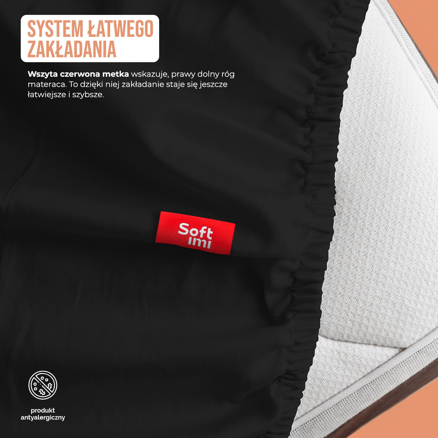 Umilamy nie tylko noce! System łatwego zakładania - Istnieje jeszcze jedna rzecz, która sprawia, że nasze prześcieradła są wyjątkowe - wszyta czerwona metka. To dzięki niej zakładanie staje się jeszcze łatwiejsze i szybsze. Odszukaj czerwoną metkę SOFTIMI, umieść ją na prawym dolnym rogu materaca, załóż pozostałe rogi prześcieradła i voilà - Śpij dobrze!
