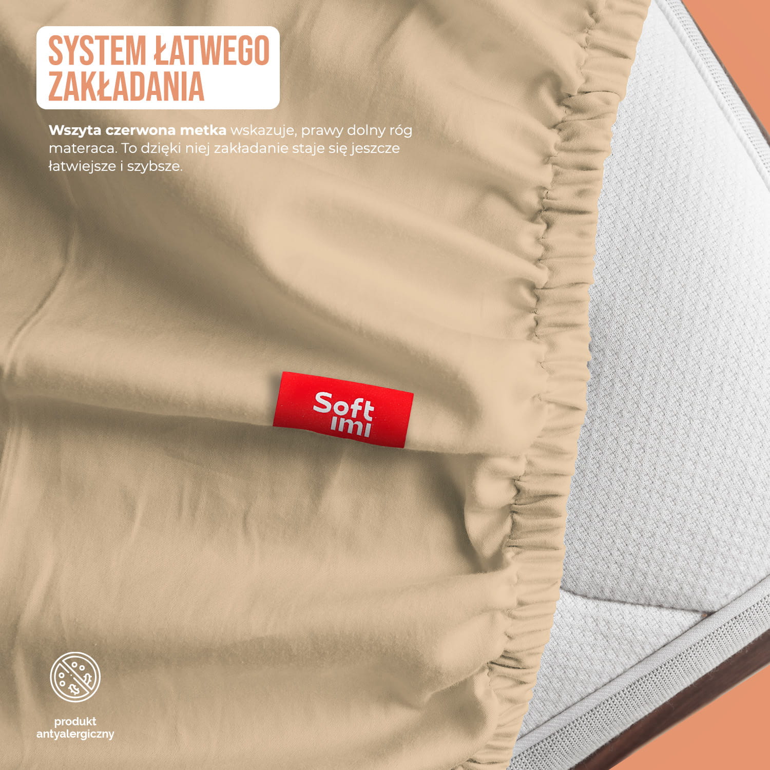 Umilamy nie tylko noce! System łatwego zakładania - Istnieje jeszcze jedna rzecz, która sprawia, że nasze prześcieradła są wyjątkowe - wszyta czerwona metka. To dzięki niej zakładanie staje się jeszcze łatwiejsze i szybsze. Odszukaj czerwoną metkę SOFTIMI, umieść ją na prawym dolnym rogu materaca, załóż pozostałe rogi prześcieradła i voilà - Śpij dobrze!